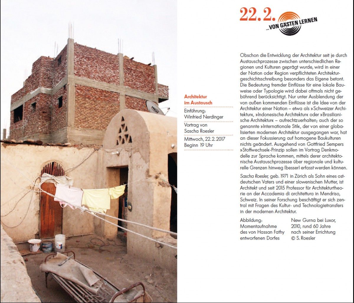 Obschon die Entwicklung der Architektur seit je durch Austauschprozesse zwischen unterschiedlichen Regionen und Kulturen geprägt wurde, wird in einer der Nation oder Region verpflichteten Architekturgeschichtsschreibung besonders das Eigene betont. Die Bedeutung fremder Einflüsse für eine lokale Bauweise oder Typologie wird dabei oftmals nicht gebührend berücksichtigt. Nur unter Ausblendung der von außen kommenden Einflüsse ist die Idee von der Architektur einer Nation – etwa als "Schweizer Architektur", "Indonesische Architektur" oder "Brasilianische Architektur" – aufrechtzuerhalten; auch der so genannte "Internationale Stil", der von einer globalisierten modernen Architektur ausgegangen war, hat an dieser Fokussierung auf homogene Baukulturen nichts geändert. Ausgehend von Gottfried Sempers "Stoffwechsel"-Prinzip sollen im Vortrag Denkmodelle zur Sprache kommen, mittels derer architektonische Austauschprozesse über regionale und kulturelle Grenzen hinweg (besser) erfasst werden können.