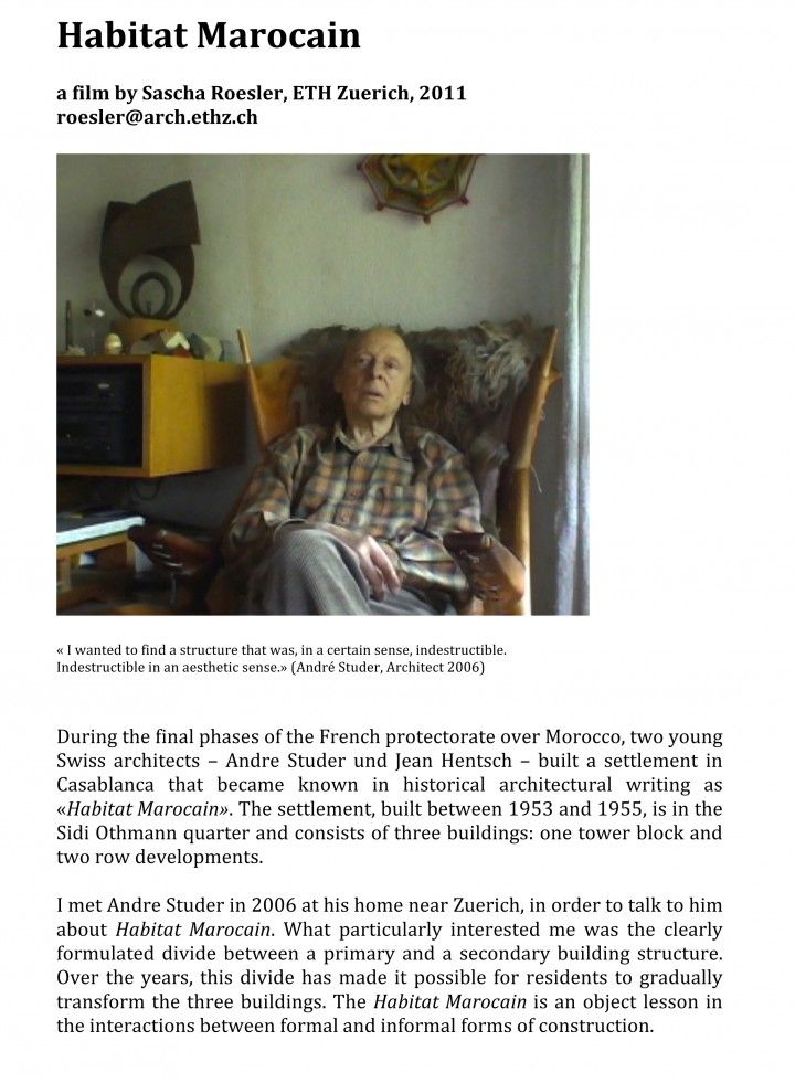 I met Andre Studer in 2006 at his home near Zuerich, in order to talk to him about Habitat Marocain. What particularly interested me was the clearly formulated divide between a primary and a secondary building structure. Over the years, this divide has made it possible for residents to gradually transform the three buildings. The Habitat Marocain is an object lesson in the interactions between formal and informal forms of construction.