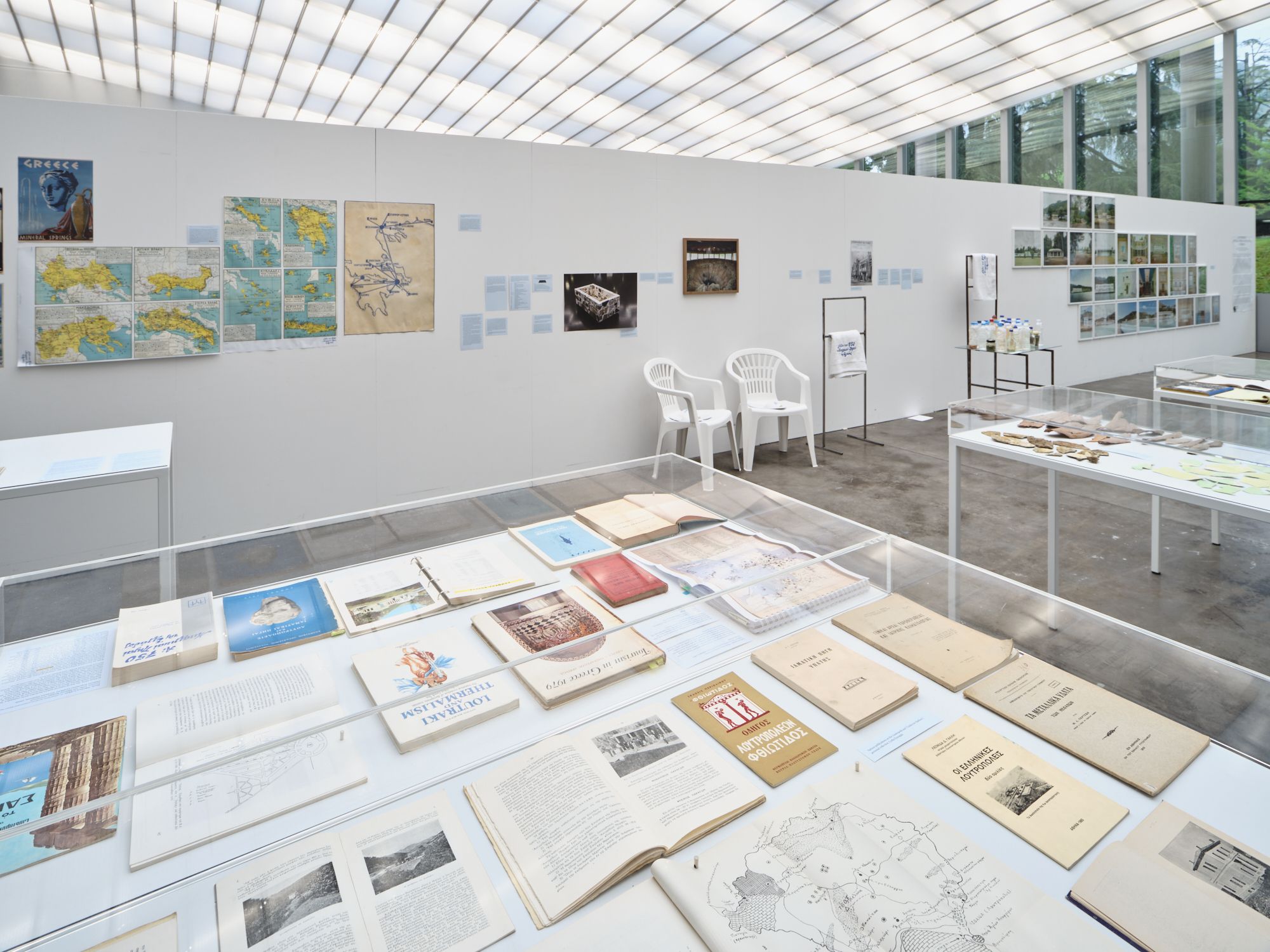This exhibition brings together rare books, posters, postcards, and historic maps alongside architectural fragments, accounting records, and various artifacts collected by Xynogala during her fieldwork - culminating in a diverse display that also includes a water bar: it contains mineral spring waters collected over the course of four years. Presented are also actions by "Friends of the 750 Mineral Springs of Greece" a non-profit association dedicated to the maintenance and preservation of an often-overlooked natural resource and cultural heritage.